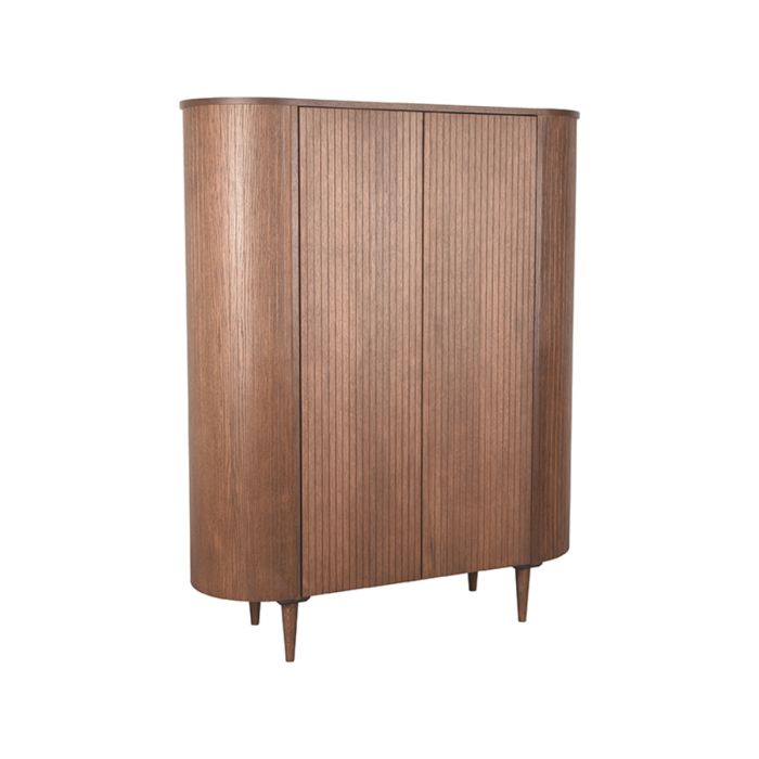 De kast Oliva in de kleur walnoot eiken heeft een stijlvolle en tijdloze uitstraling. Ze is vervaardigd uit hoogwaardig eikenfineer in een warme walnoot kleur, wat zorgt voor een natuurlijke en elegante look. De kast heeft een strak afgerond design met verticale lijnen op de deuren, wat een subtiele textuur en een modern karakter toevoegt. Binnenin zijn er meerdere legplanken, waardoor er voldoende opbergruimte is voor servies, boeken of decoratieve items.  Invouwen