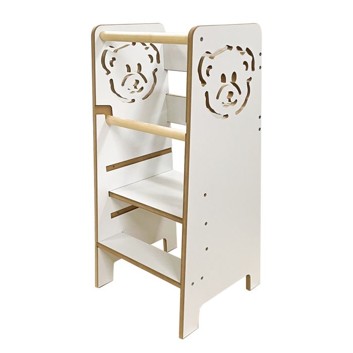 Ontmoet Leertoren Beer. Een leertoren die even vriendelijk oogt als hij functioneel is. Met een speels uitgesneden berengezicht als knipoog naar de kinderlijke verbeelding, nodigt deze toren uit tot ontdekken, meedoen en groeien. Een veilige opstap naar zelfstandigheid in een stijlvol jasje. Het vriendelijke berenmotief aan beide zijden geeft de toren een warme uitstraling, waardoor hij niet alleen een hulpmiddel is, maar ook een herkenbaar maatje tijdens dagelijkse rituelen zoals handen wassen of helpen koken. Invouwen