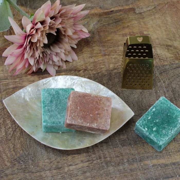 - Een schaaltje van schelp, dat zorgt voor een stijlvolle presentatie en voorkomt dat de blokjes vlekken maken op meubels of schapjes.