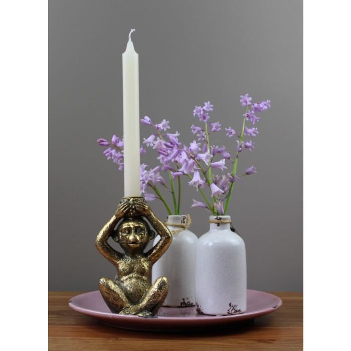 - Goudkleurige kandelaar in de vorm van een zittend aapje, met de handen boven het hoofd. Een speels en kunstzinnig kaarsenhouder, perfect voor een dinerkaars.