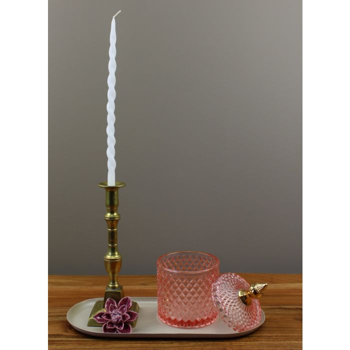 - Een potje van roze glas met gouden details op de deksel: perfect voor een geurige kaars, een snoepje of gewoon als decoratief item.