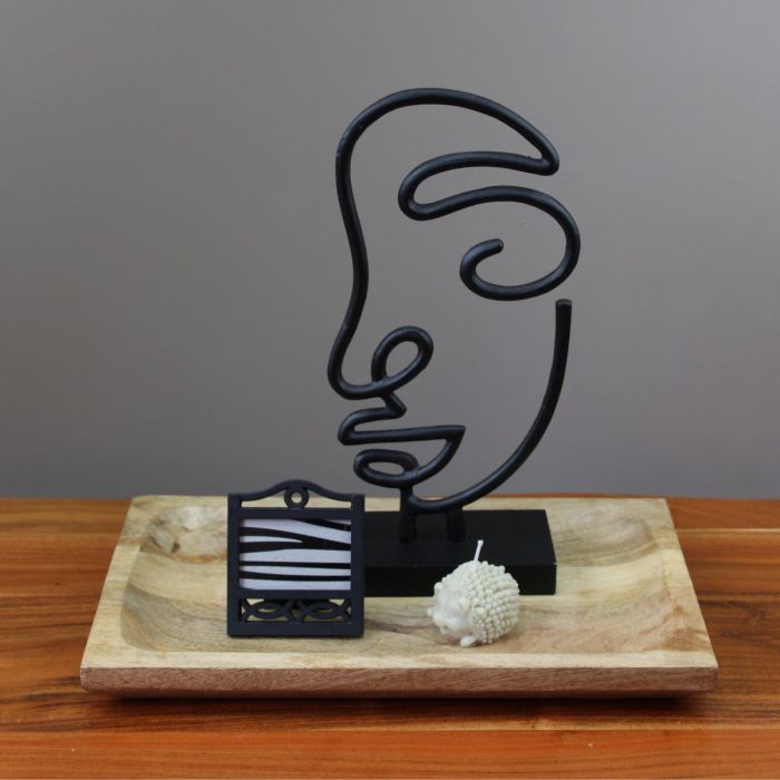 - Een morderne zwarte metalen sculptuur in abstract gezichtsvorm. De blikvanger van deze set.